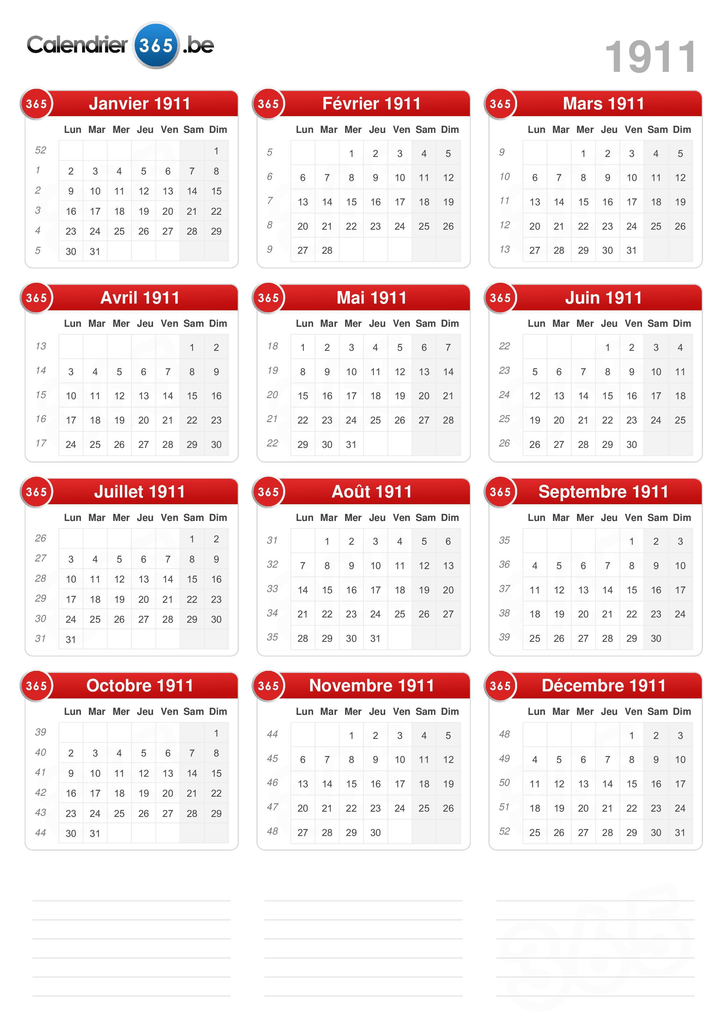 Le calendrier 1911 est généré automatiquement et vous pouvez le regarder toujours ici online. Vous pouvez aussi regarder les calendriers mensuel de 1911 et y compris les numéros de semaine si vous cliquez sur un mois ci-dessus. En plus vous trouverez les années bissextiles, les marées annuelles, l’heure d’été et d’hiver, la phase lunaire actuelle de 1911, le calendrier mensuel de 1911 et les horloges universelles via le menu en haut de cette page.Regardez aussi Calendrier 1912.