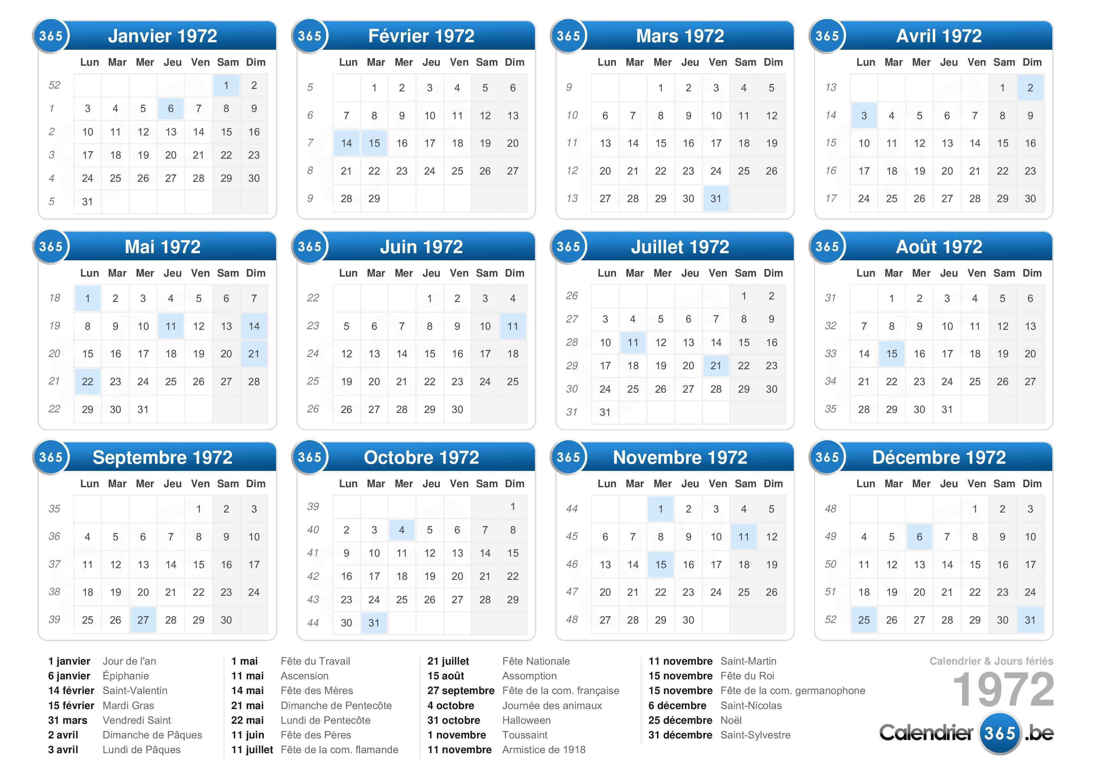 Télécharger le calendrier avec jours fériés 1972 pour impression.