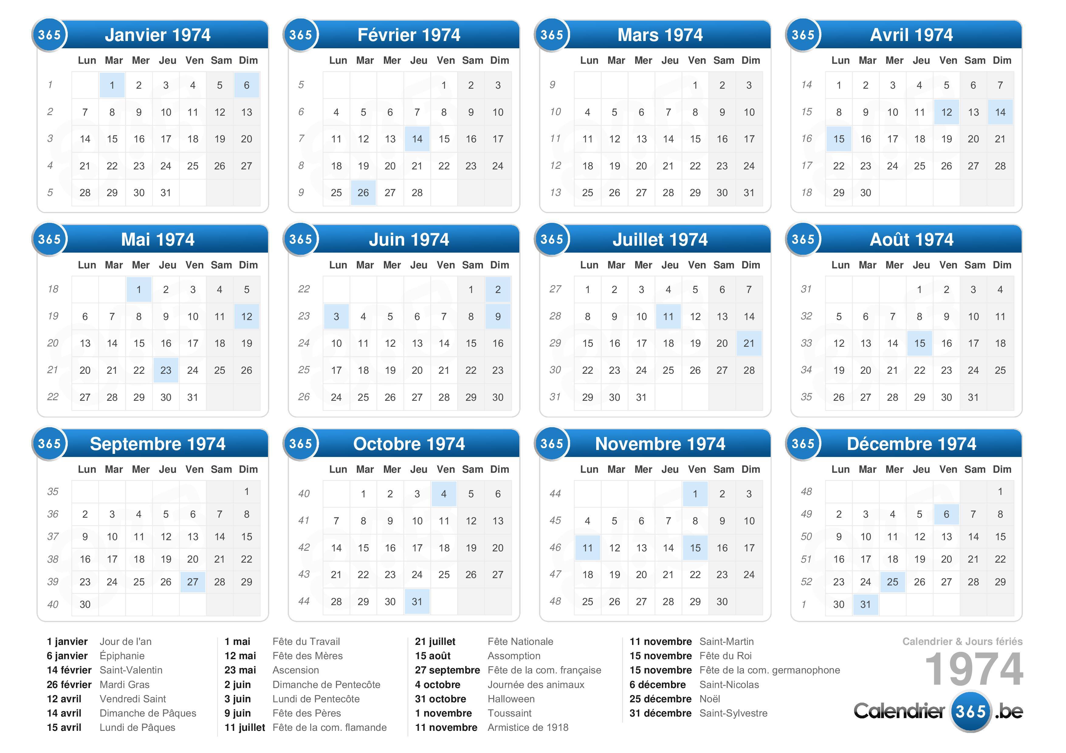 Télécharger le calendrier avec jours fériés 1974 pour impression.