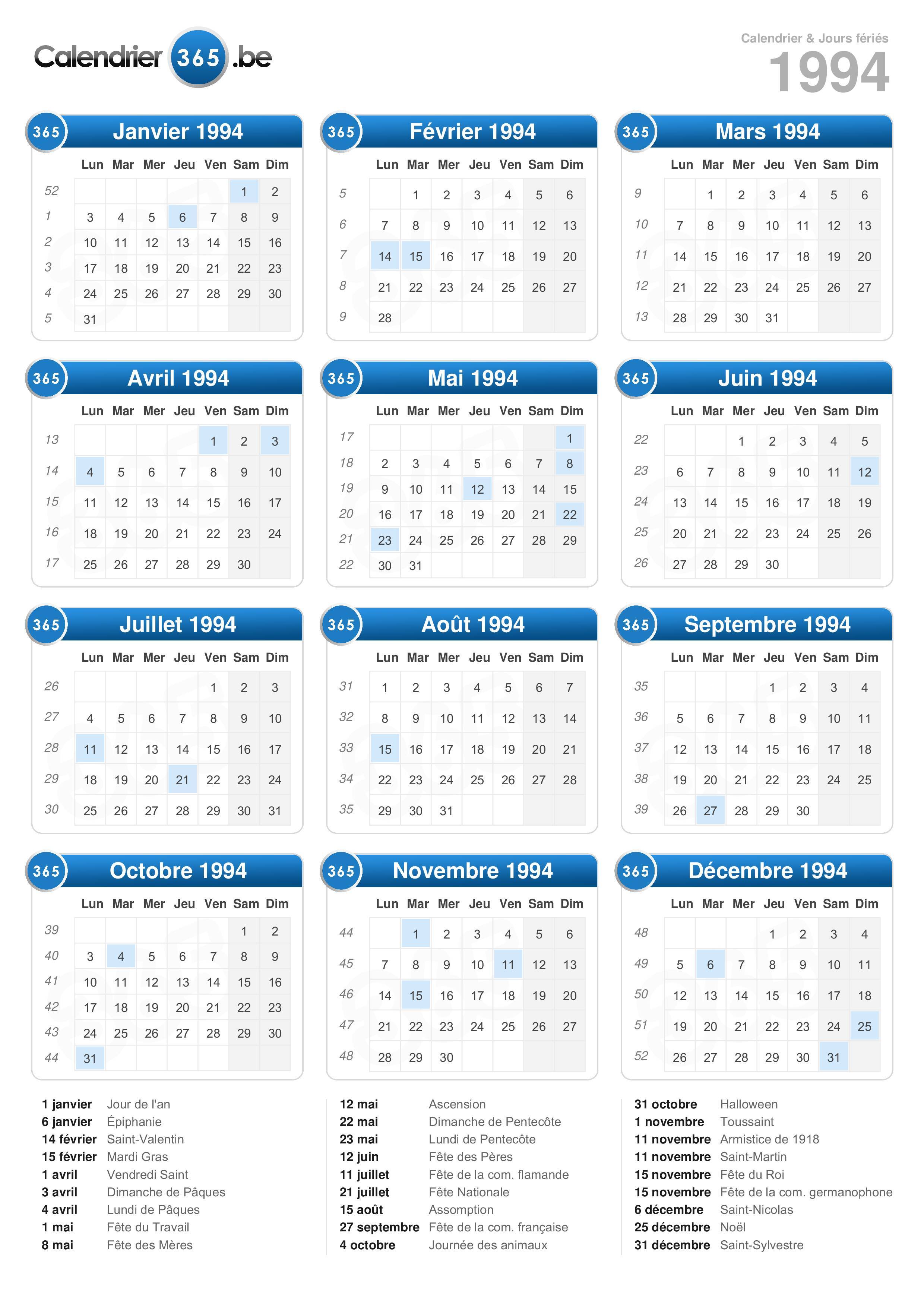 Télécharger le calendrier avec jours fériés 1994 pour impression.