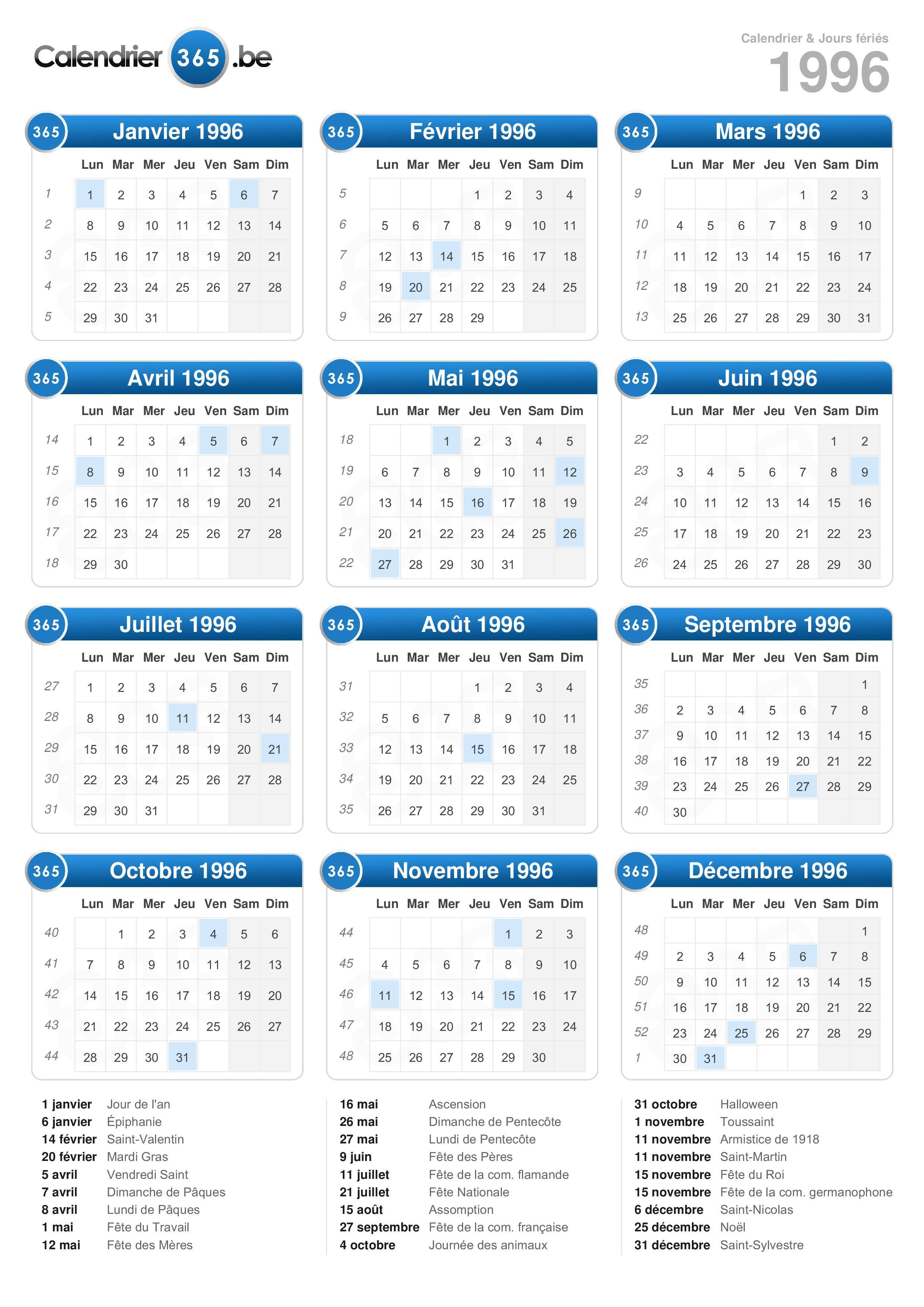Télécharger le calendrier avec jours fériés 1996 pour impression.