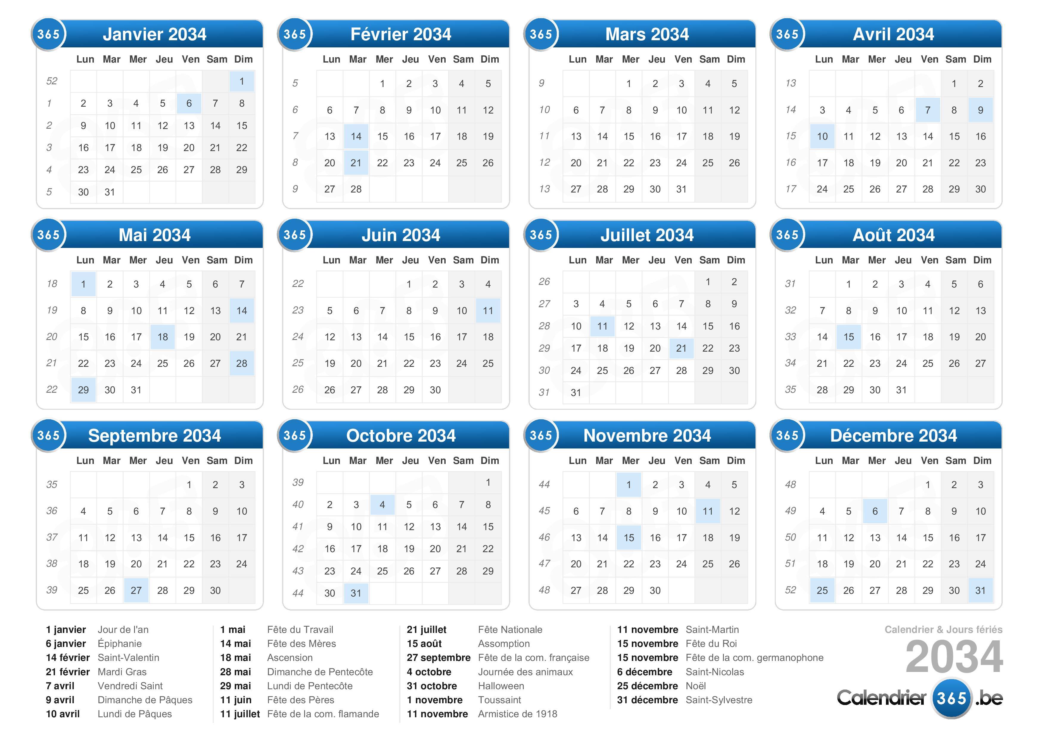 Télécharger le calendrier avec jours fériés 2034 pour impression.