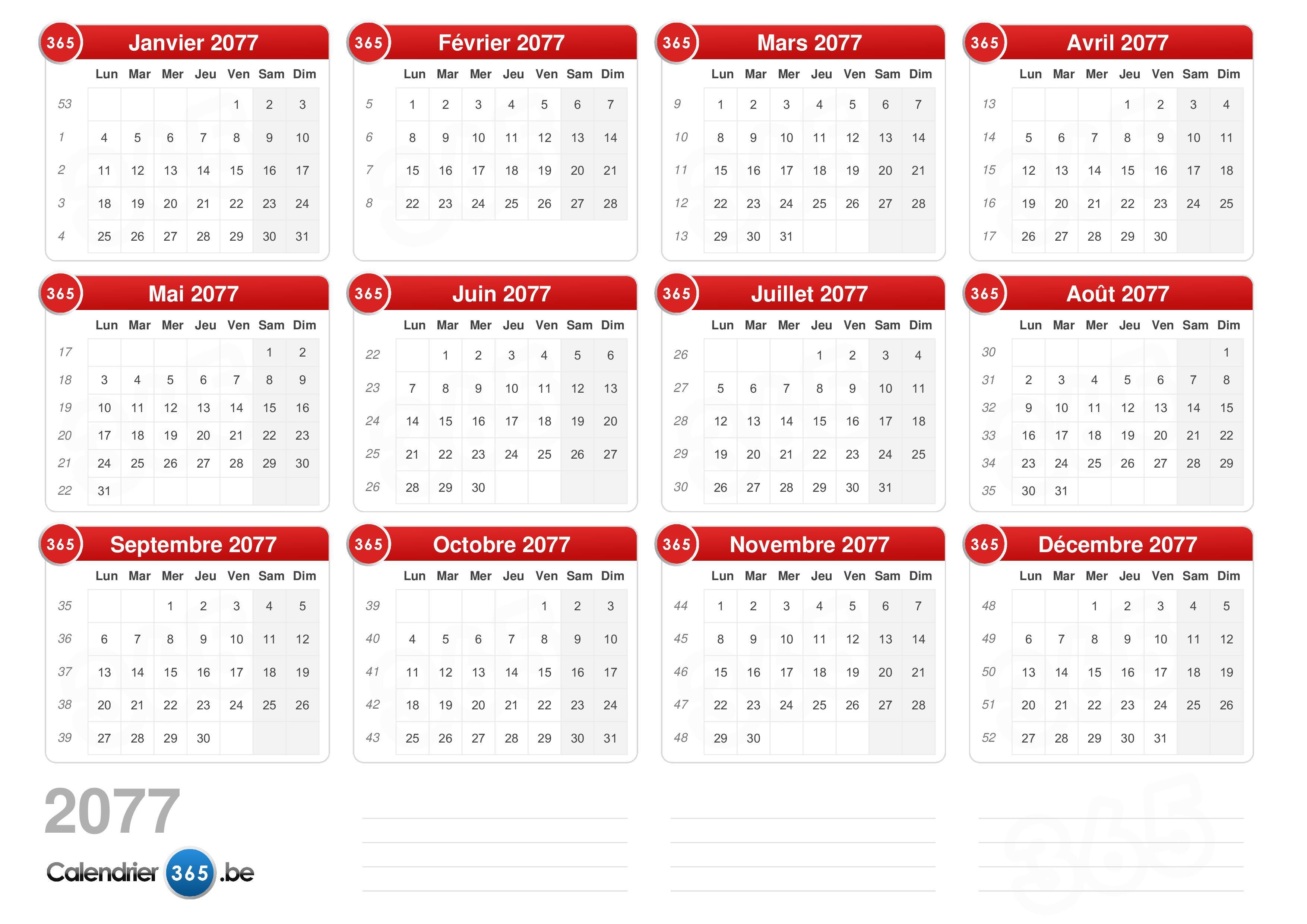 Le calendrier 2077 est généré automatiquement et vous pouvez le regarder toujours ici online. Vous pouvez aussi regarder les calendriers mensuel de 2077 et y compris les numéros de semaine si vous cliquez sur un mois ci-dessus. En plus vous trouverez les années bissextiles, les marées annuelles, l’heure d’été et d’hiver, la phase lunaire actuelle de 2077, le calendrier mensuel de 2077 et les horloges universelles via le menu en haut de cette page.Regardez aussi Calendrier 2078.