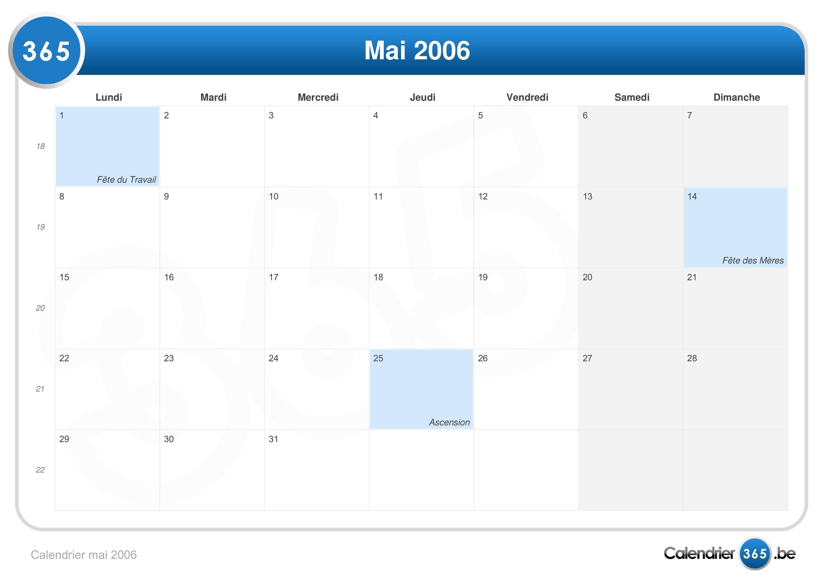 Trouvez ici le calendrier mensuel de mai 2006 et y compris les numéros de semaine.| 1 mai | Fête du Travail |