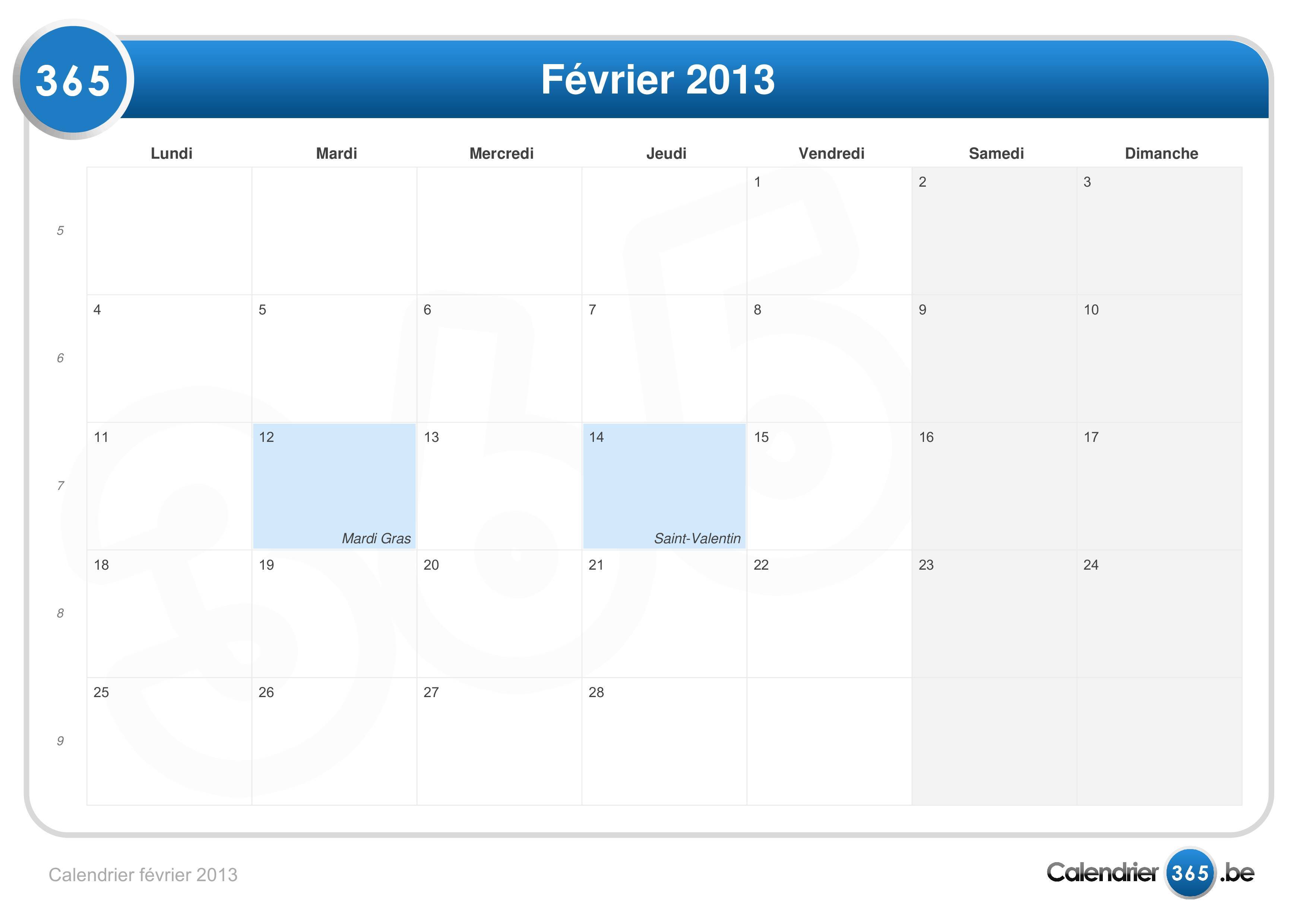 Trouvez ici le calendrier mensuel de février 2013 et y compris les numéros de semaine.| 12 février | Mardi Gras |