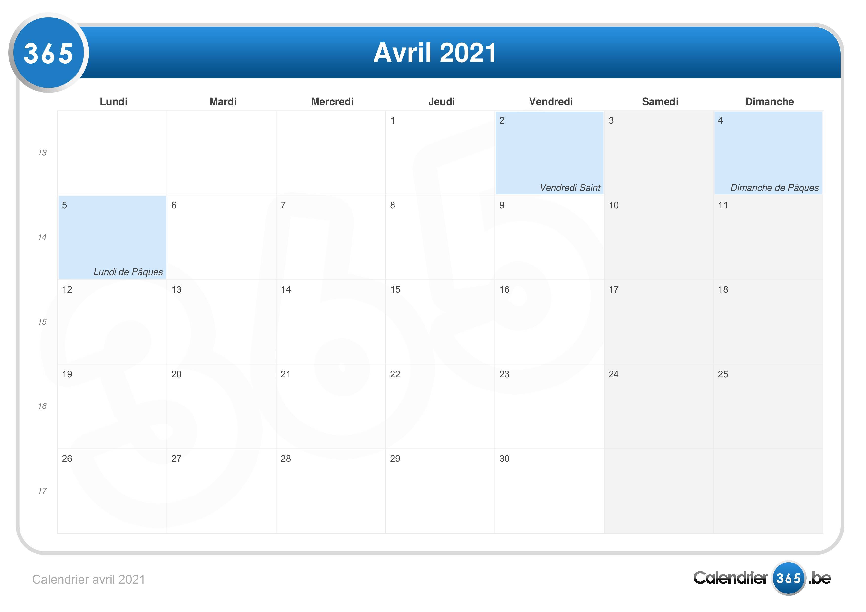 Calendrier avril 2021 (Format paysage)Aller au Calendrier 2021.
