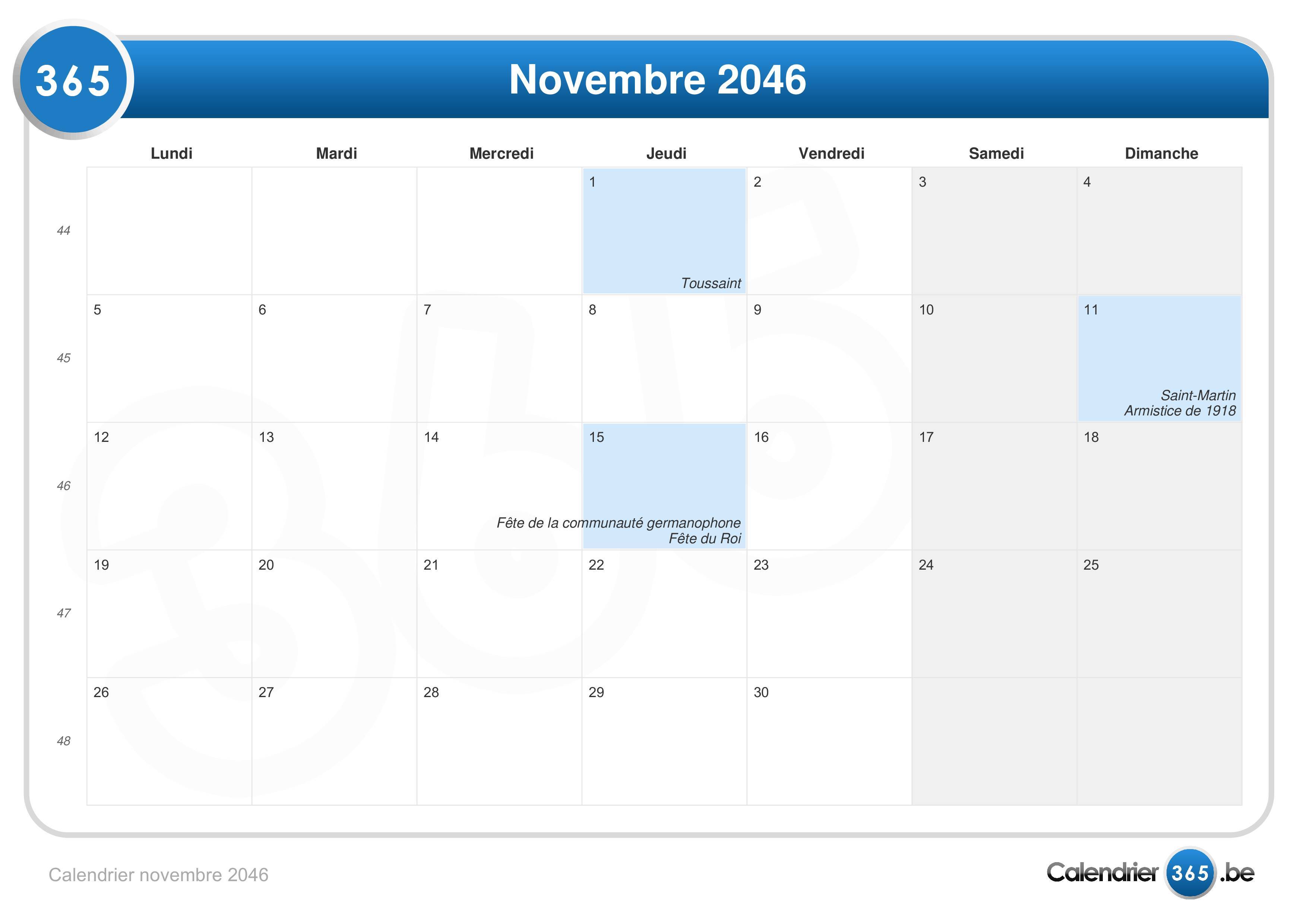 Calendrier novembre 2046 (Format paysage)Aller au Calendrier 2046.