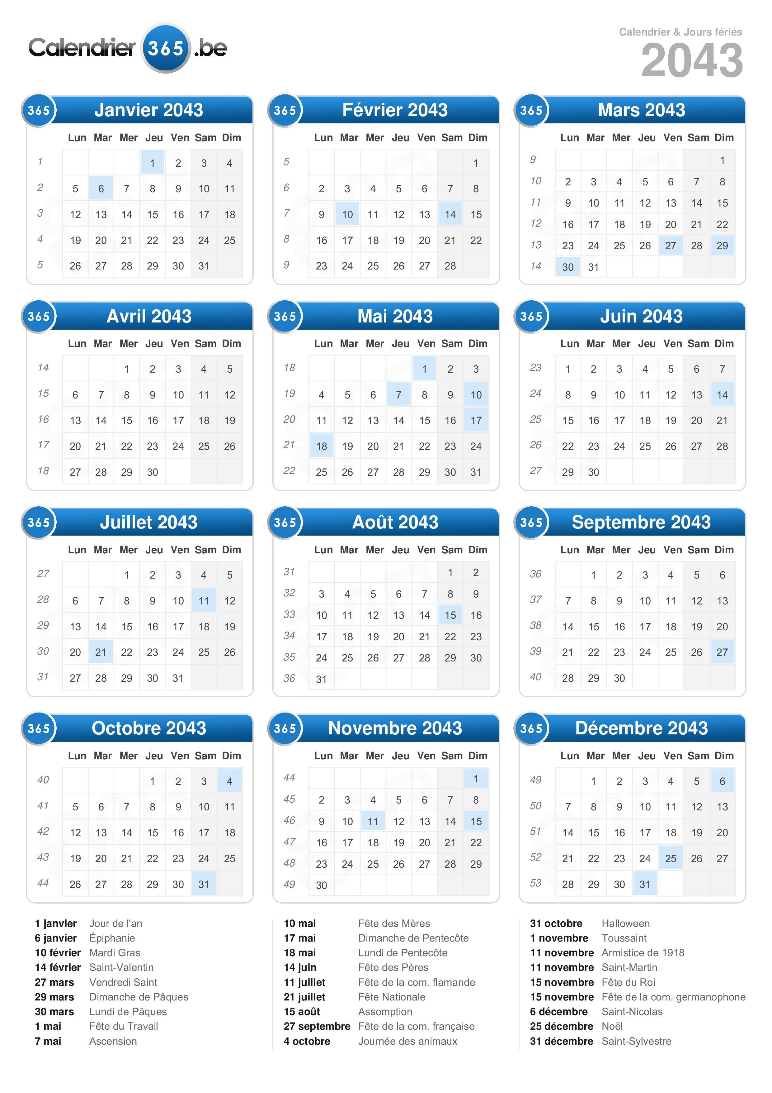 Télécharger le calendrier avec jours fériés 2043 pour impression.